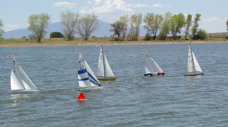 Vic Rotolo arranged with the Zia Pueblo to sail at no cost on their lake this year. This lake is about 1/4 mile across and 1/2 mile long. Because of rocks, a dam, sandbars and weeds, the sailing areas were limited to three locations. Buoys had to be towed out by a boat (tug or soling). The longer courses were both cursed and heralded. Out-of-control boats were sometimes difficult to retrieve. This lake is 45 minutes from Albuquerque, West of Bernalillo on Highway US 550.